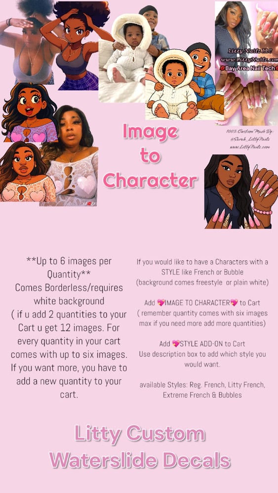 ** if you want more characters or images you would need to add More Quantities each quantity comes with a maximum of 6 characters/images